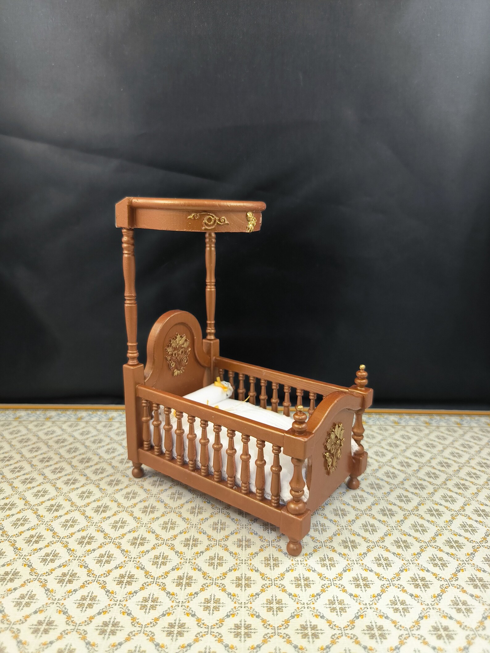 Minicuna con dosel de roble para casa de muñecas escala 1/12, victoriana