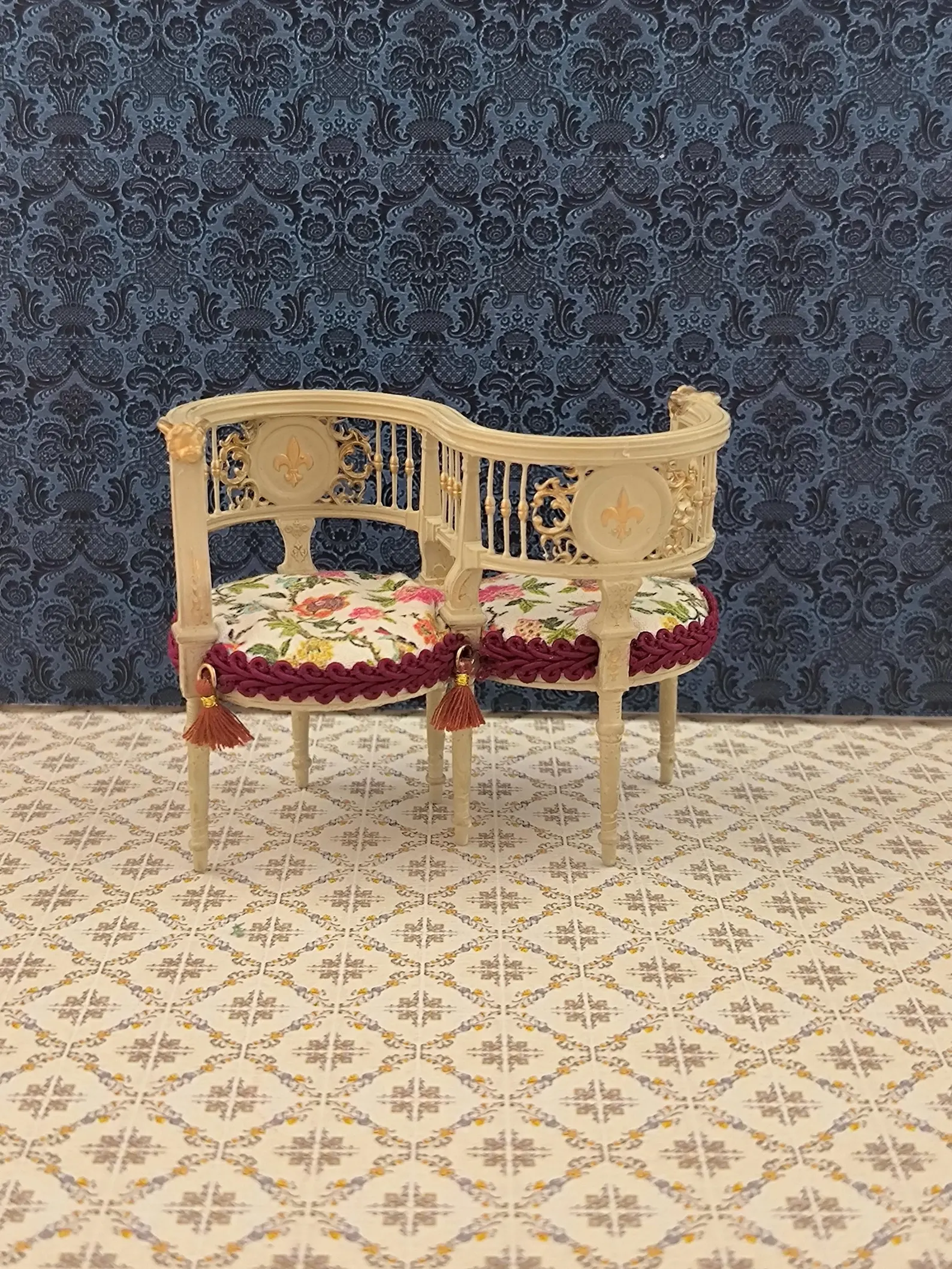 Silla de salón antigua victoriana conversación en miniatura para casa de muñecas escala 1 12
