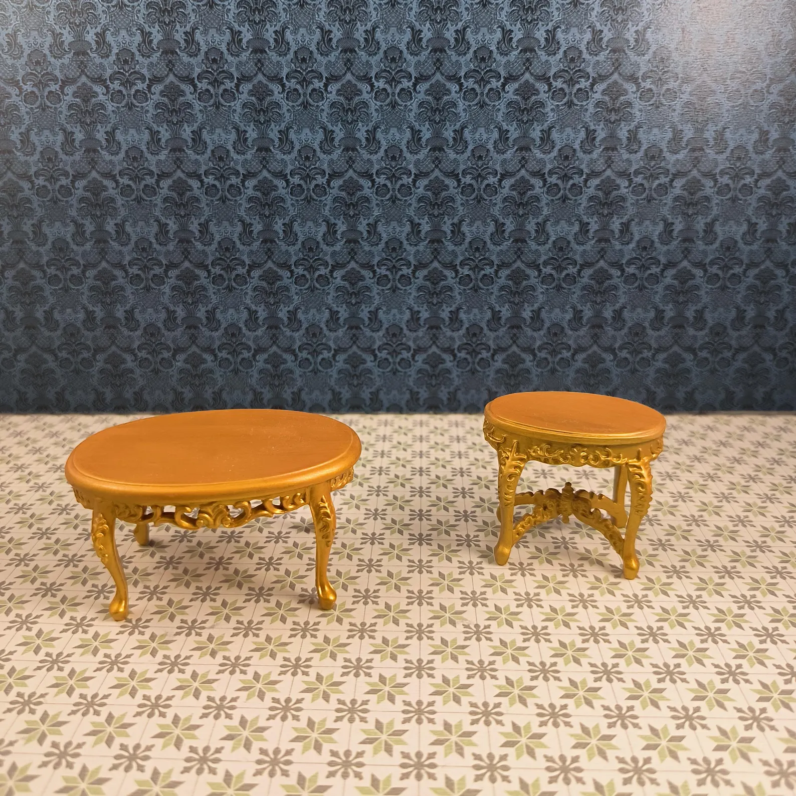set aus zwei viktorianischen Couchtischen, Miniatur, Maßstab 1/12 für Puppenhaus