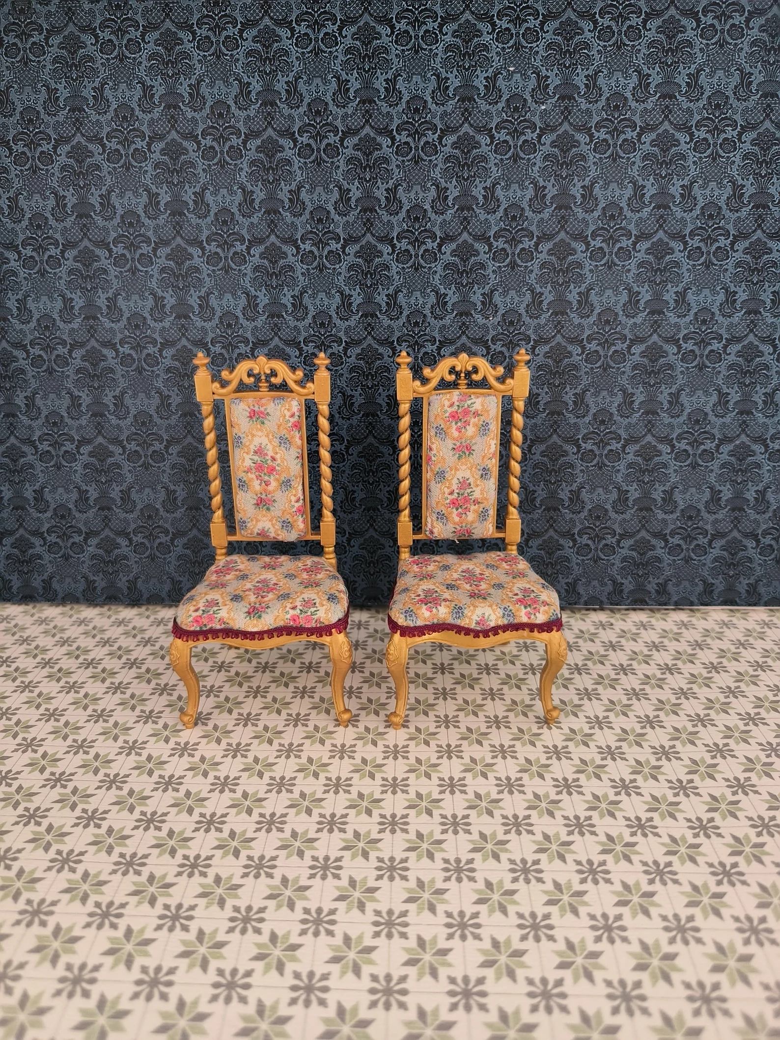 Miniatur Satz von 2 viktorianischen Stühlen in 1/12 Maßstab für Puppenhaus